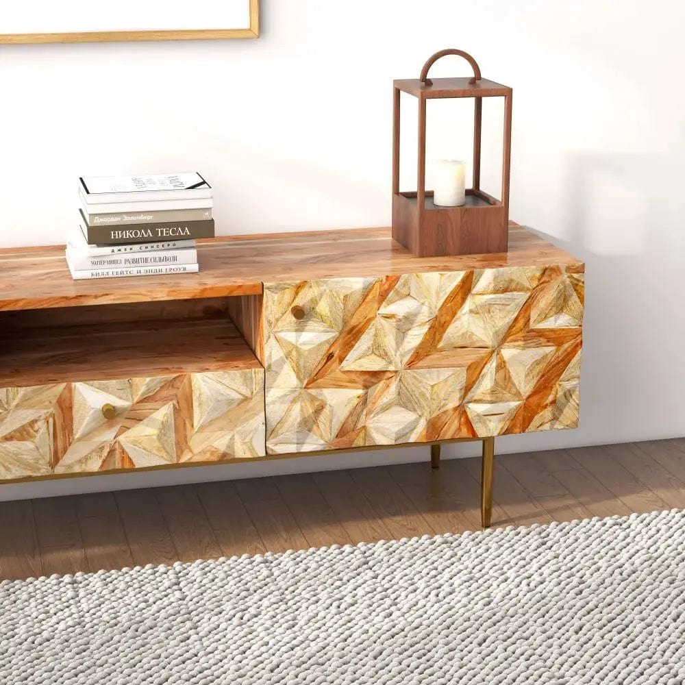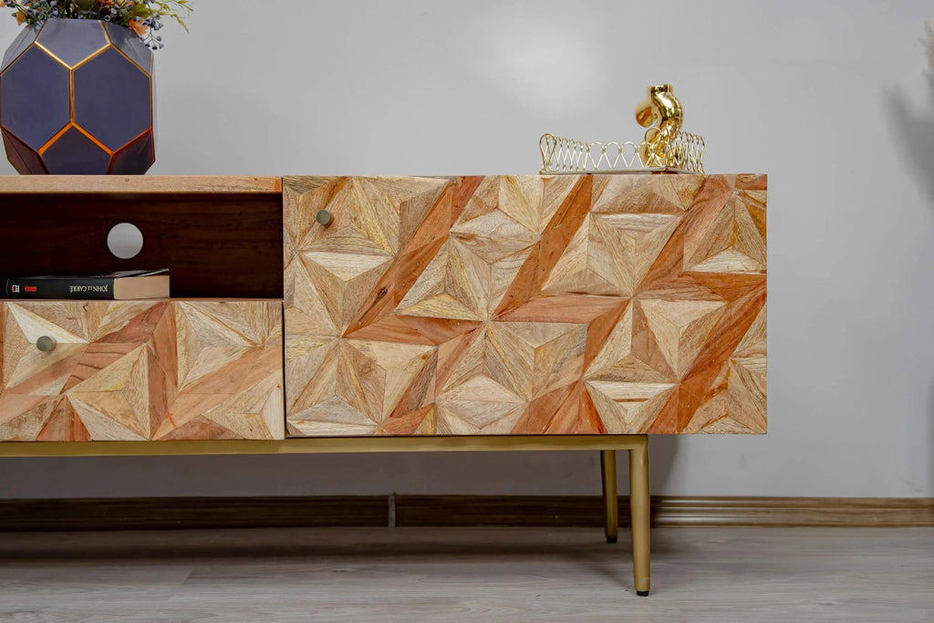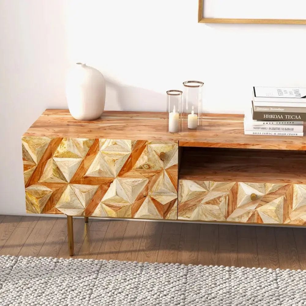 - Comoda TV „Diamond” este o piesă de mobilier proiectată cu o atenție deosebită la detaliu, combinând funcționalitatea necesară pentru dispozitivele media cu un design artistic impresionant. Fabricată din lemn masiv de salcam, această comodă nu numai că asigură o durabilitate excepțională, dar și aduce un element natural și cald în decorul oricărui spațiu de locuit.