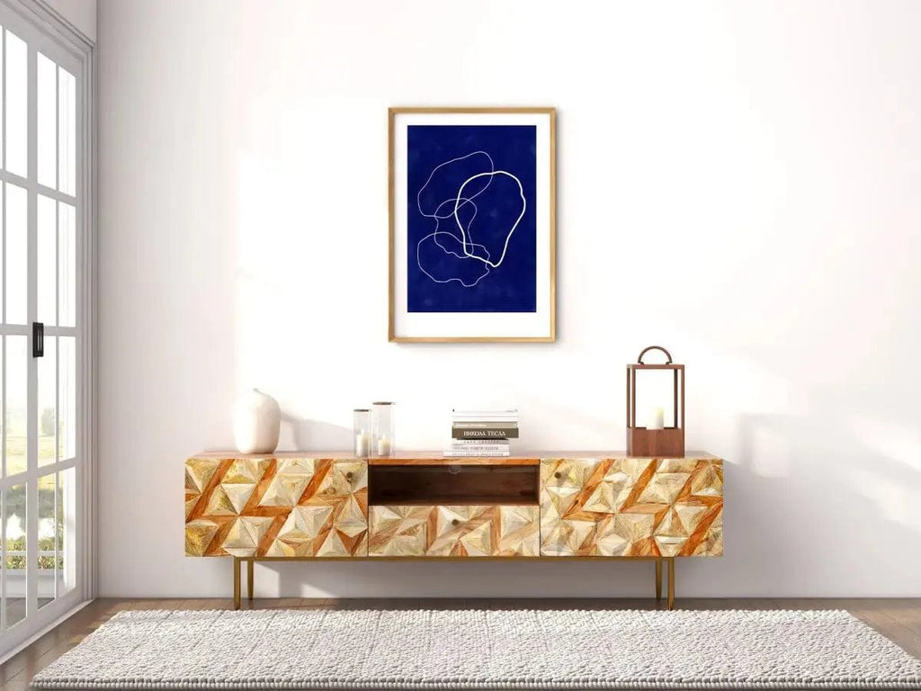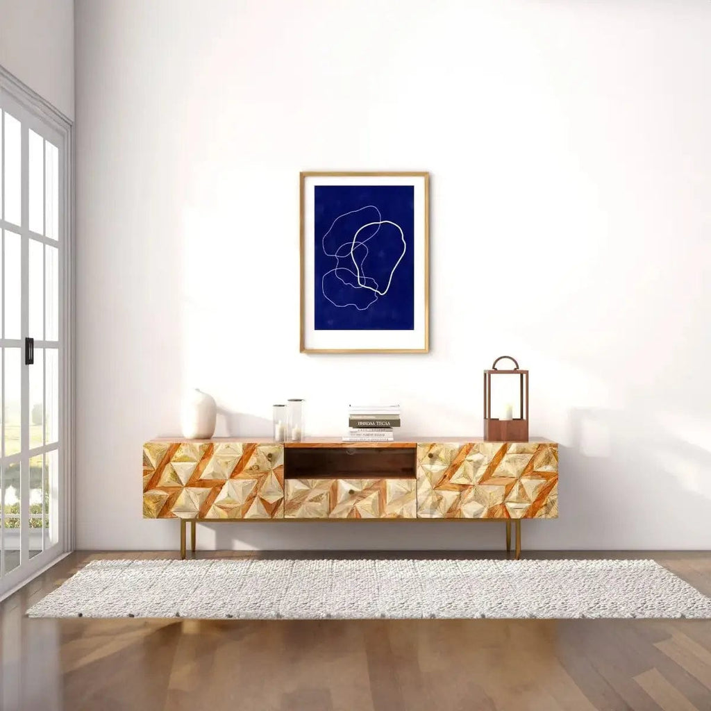 - Dimensiunile generoase ale comodei, cu o lungime de 180 cm, o lățime de 40 cm și o înălțime de 53 cm, oferă suficient spațiu pentru acomodarea unui televizor mare, precum și pentru diverse alte echipamente electronice și media. Designul frontal al comodei este deosebit, având forme geometrice neregulate și ieșite în relief, sculptate direct în lemnul de trandafir. Aceste forme adaugă un caracter unic și un dinamism vizual piesei, transformând comoda „Diamond” într-un punct focal în orice încăpere.