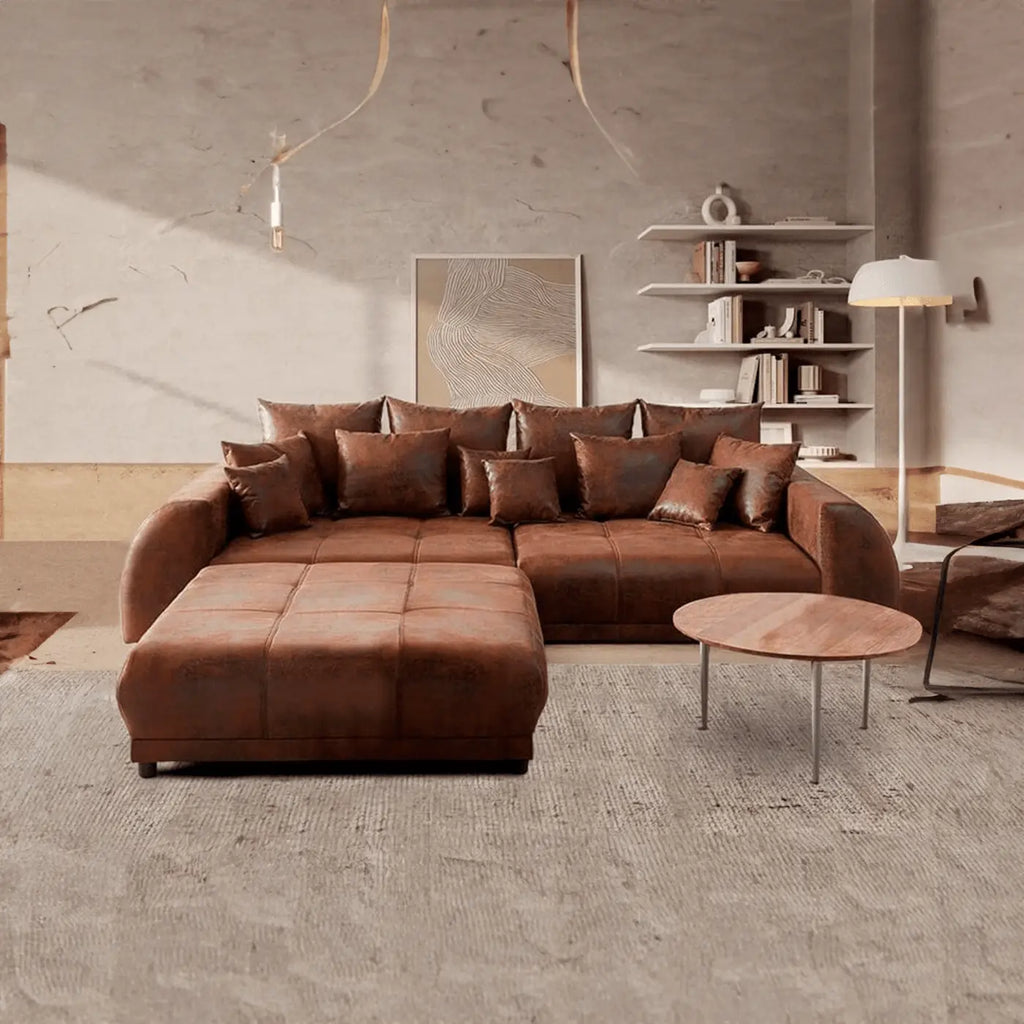 Canapea extensibilă dumonde cu 2 lăzi de depozitare si sezut confortabil din spuma HR, Big Sofa Verona Brown 310x100 cm cu taburet inclus