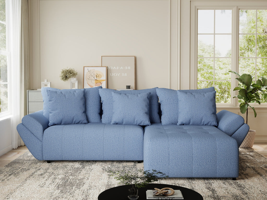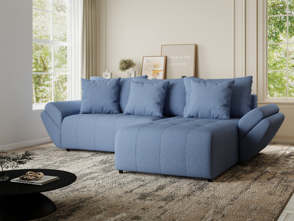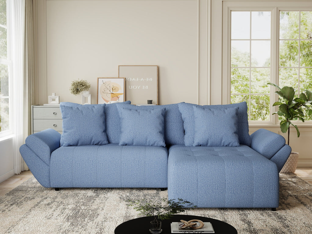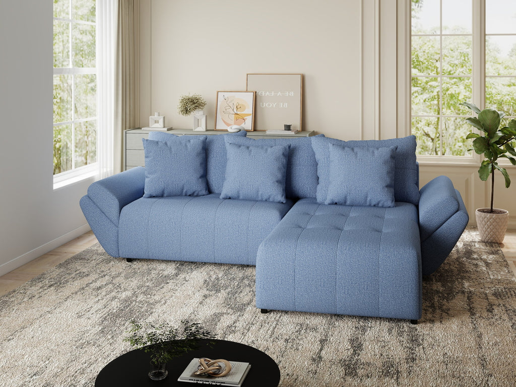 - Un colțar extensibil generos ce va impresiona prin originalitate și stil; Tapițat cu material texturat din stofă rezistentă;