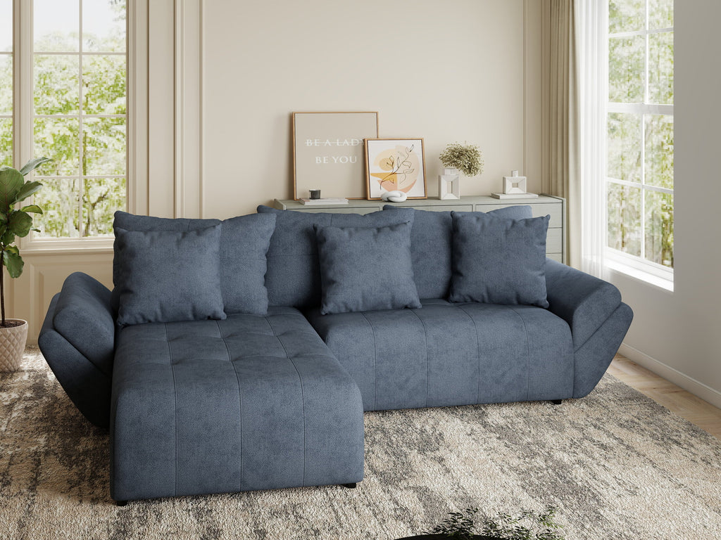• Un colțar extensibil generos ce va impresiona prin originalitate și stil; Tapițat cu material texturat din stofă rezistentă;