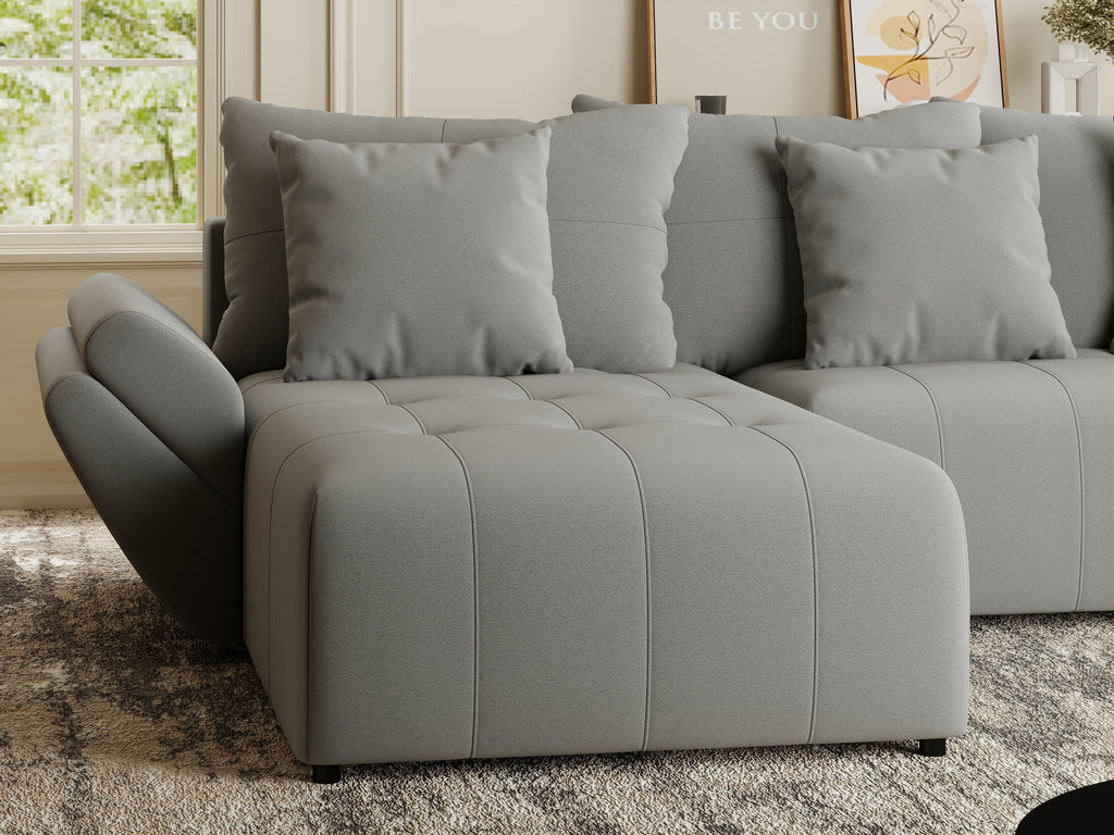 • Șezutul confortabil este prevăzut cu umplutură de spumă de inaltă densitate iar pernele din fața spătarului oferă stabilitate. Devine un real ajutor atunci când aveți musafiri peste noapte, prin transformarea ușoară și rapida într-un pat confortabil și generos.