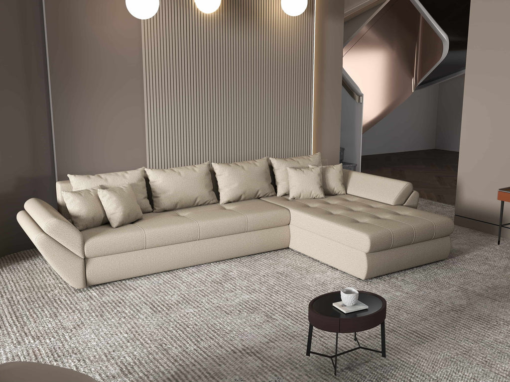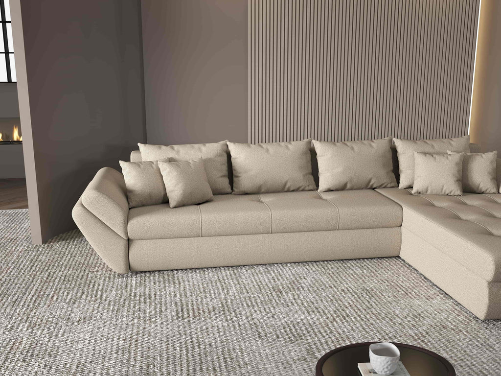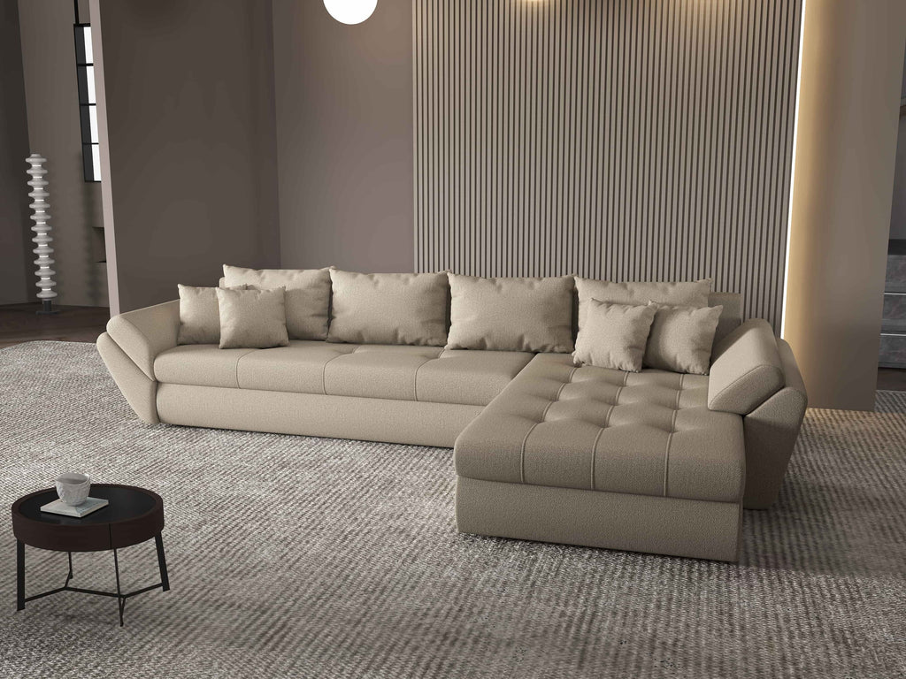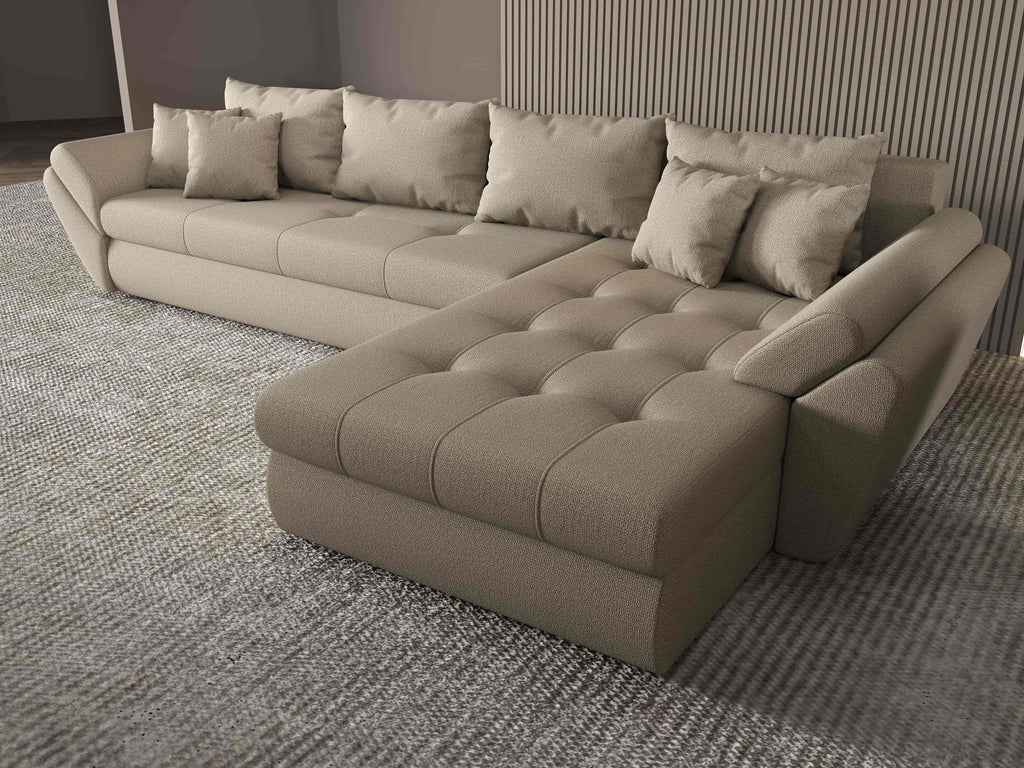 Colțar extensibil dumonde cu ladă de depozitare si sezut confortabil din spuma HR, Loana XL Enjoy Camel II 335x185 cm