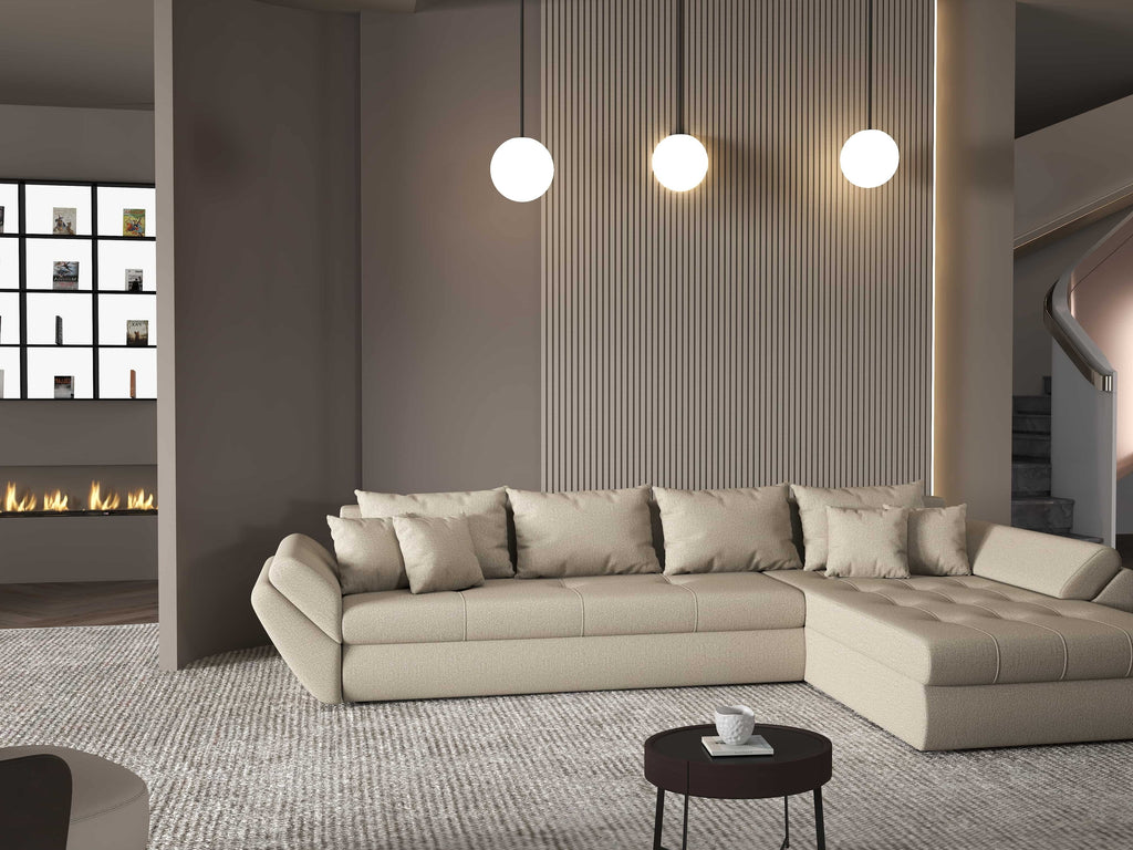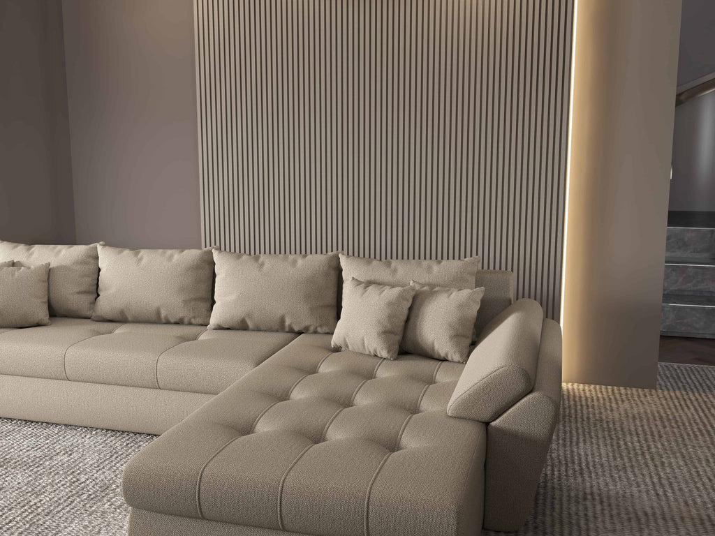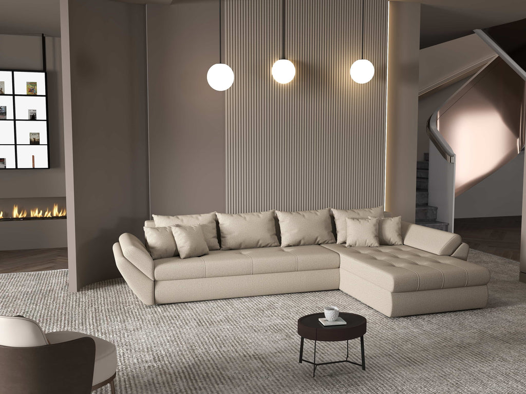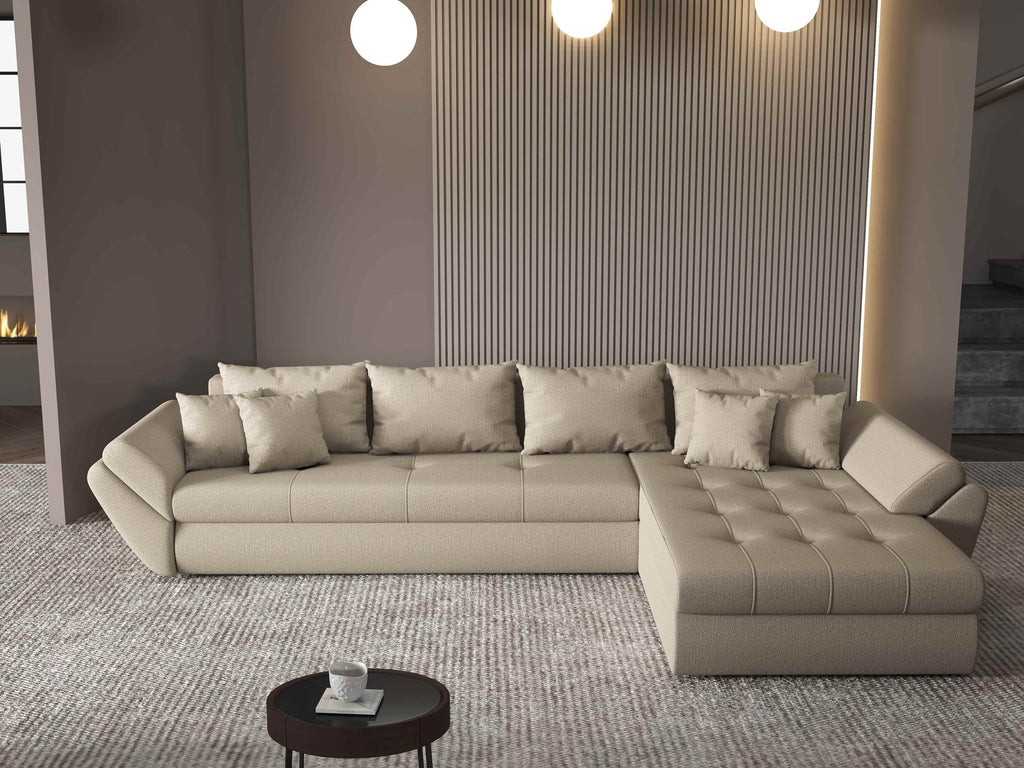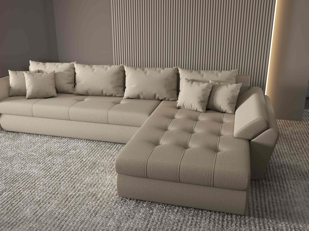 Colțar extensibil dumonde cu ladă de depozitare si sezut confortabil din spuma HR, Loana XL Enjoy Camel II 335x185 cm