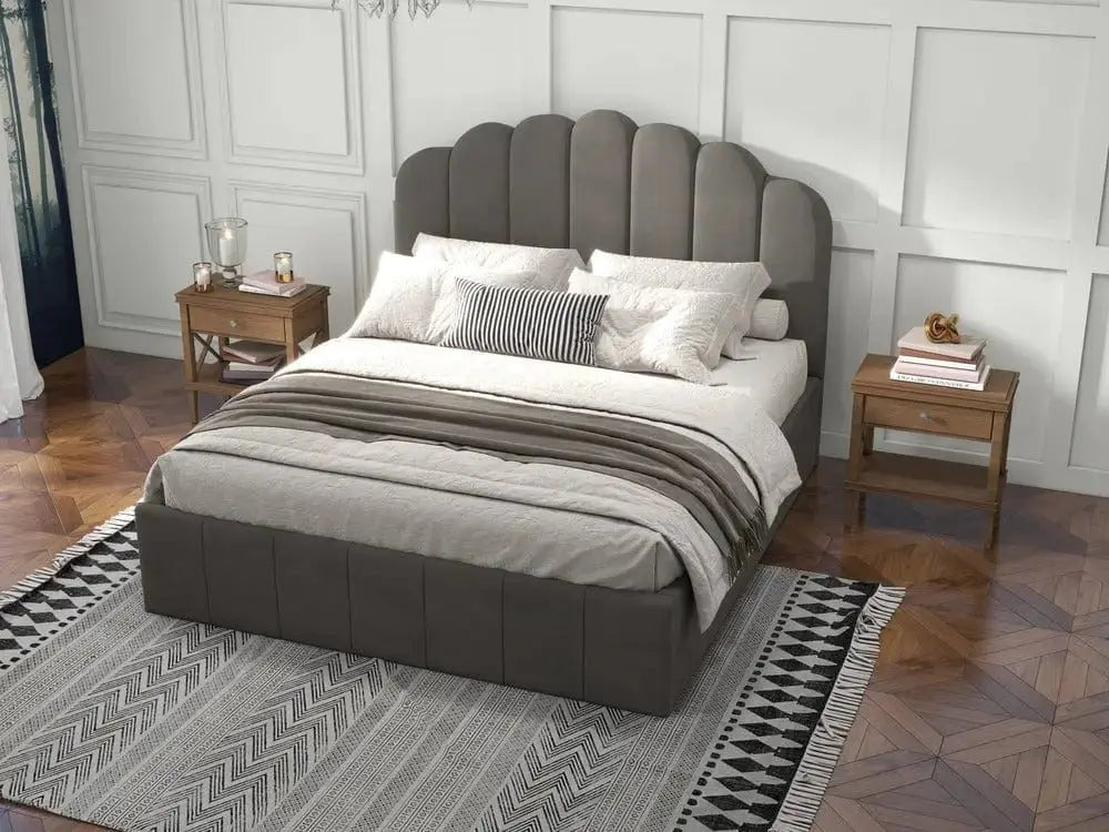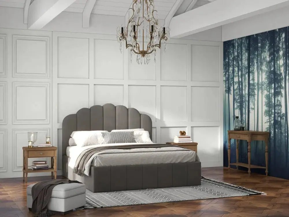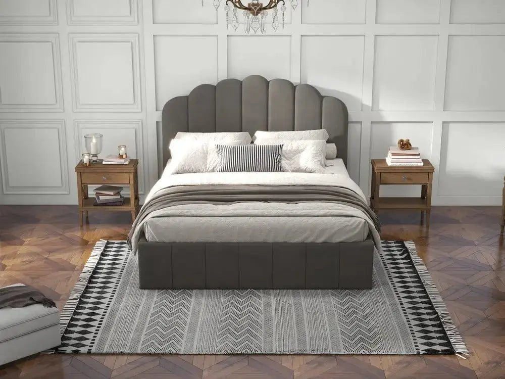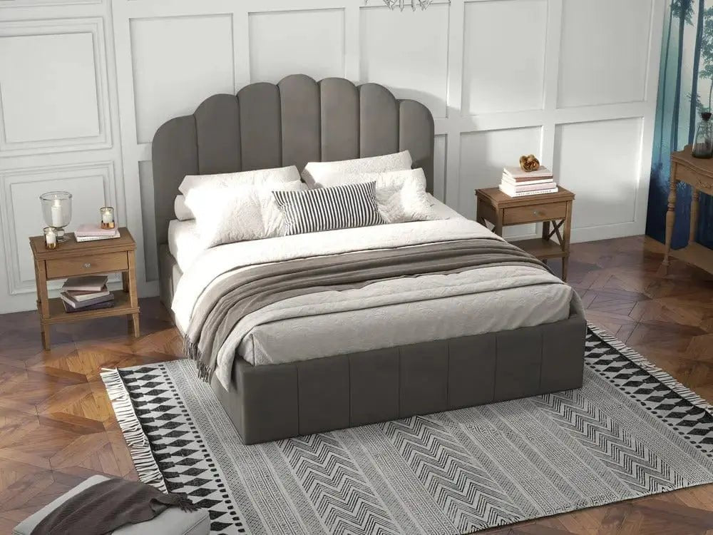 Pat dormitor dumonde, tapitat bej, Amira 180x200 cm, somiera rabatabila inclusa, spatiu depozitare