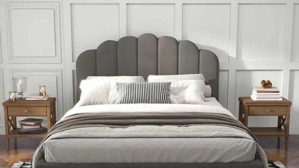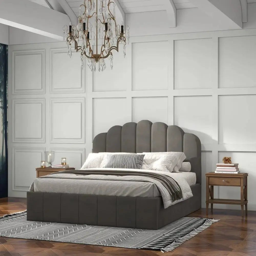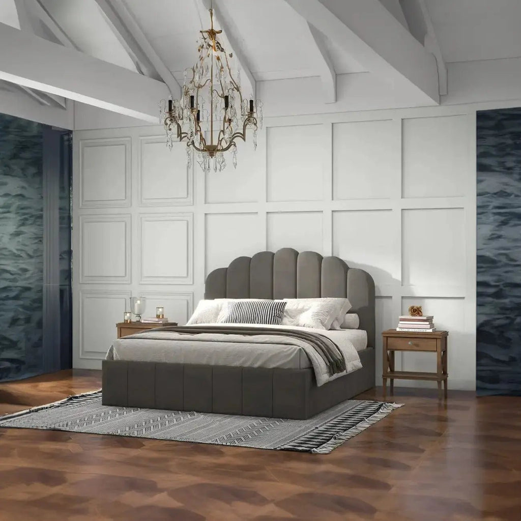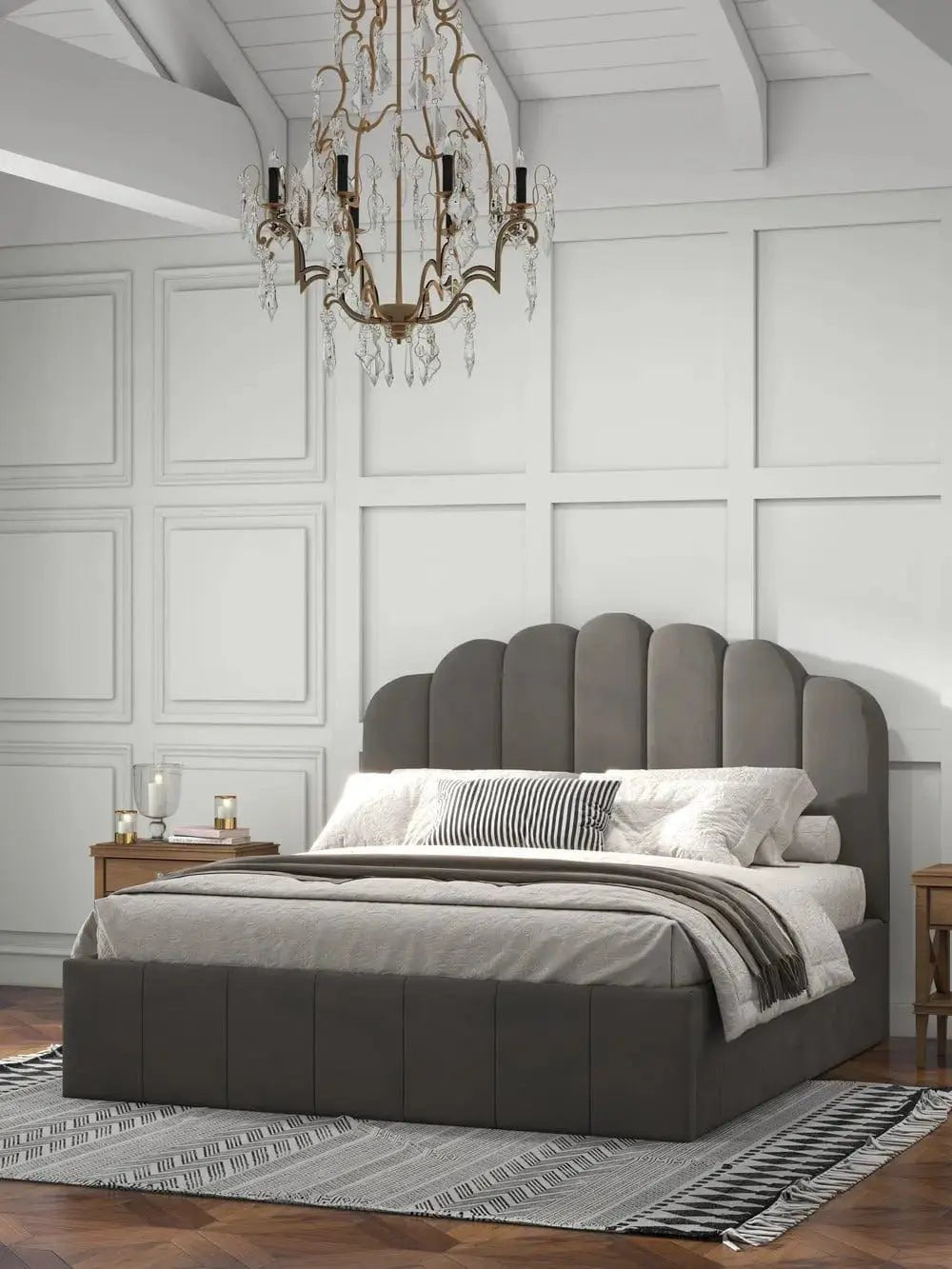 Pat dormitor dumonde, tapitat bej, Amira 180x200 cm, somiera rabatabila inclusa, spatiu depozitare