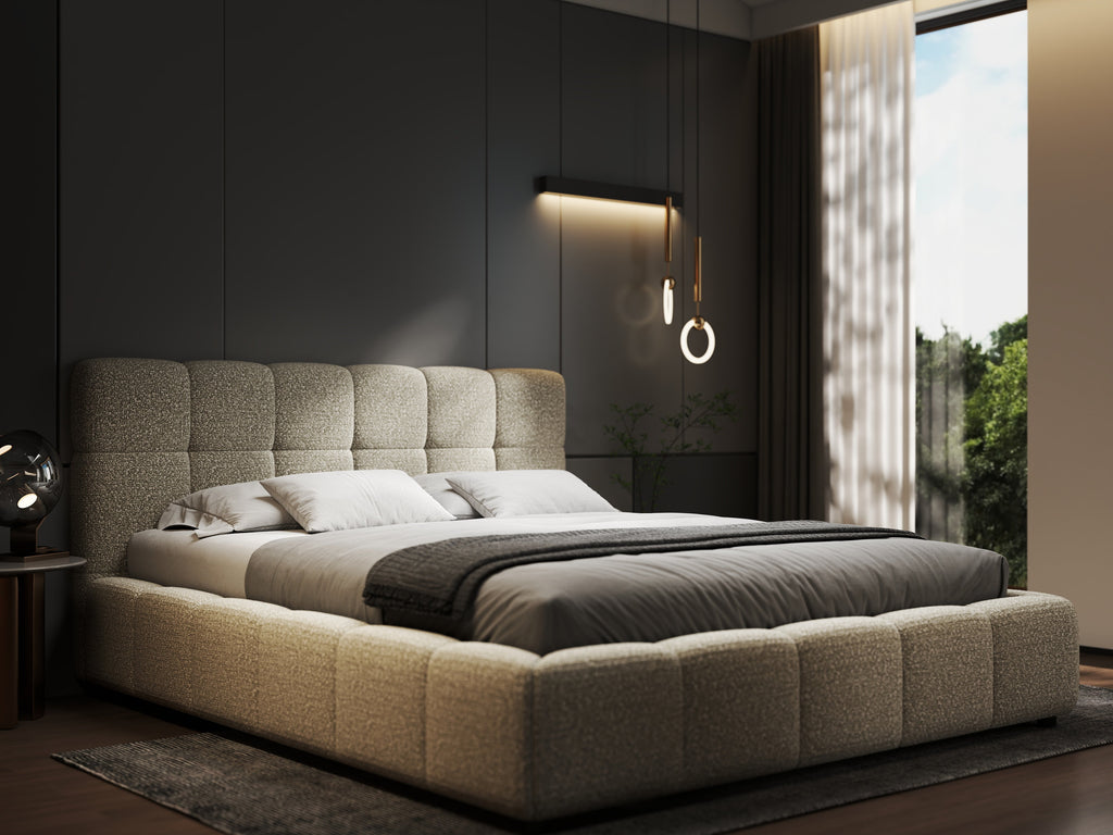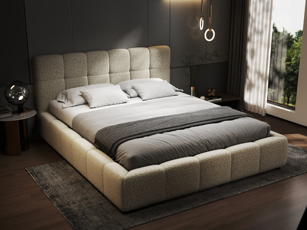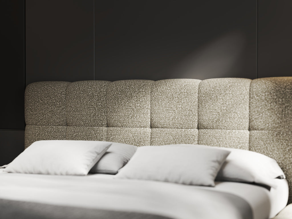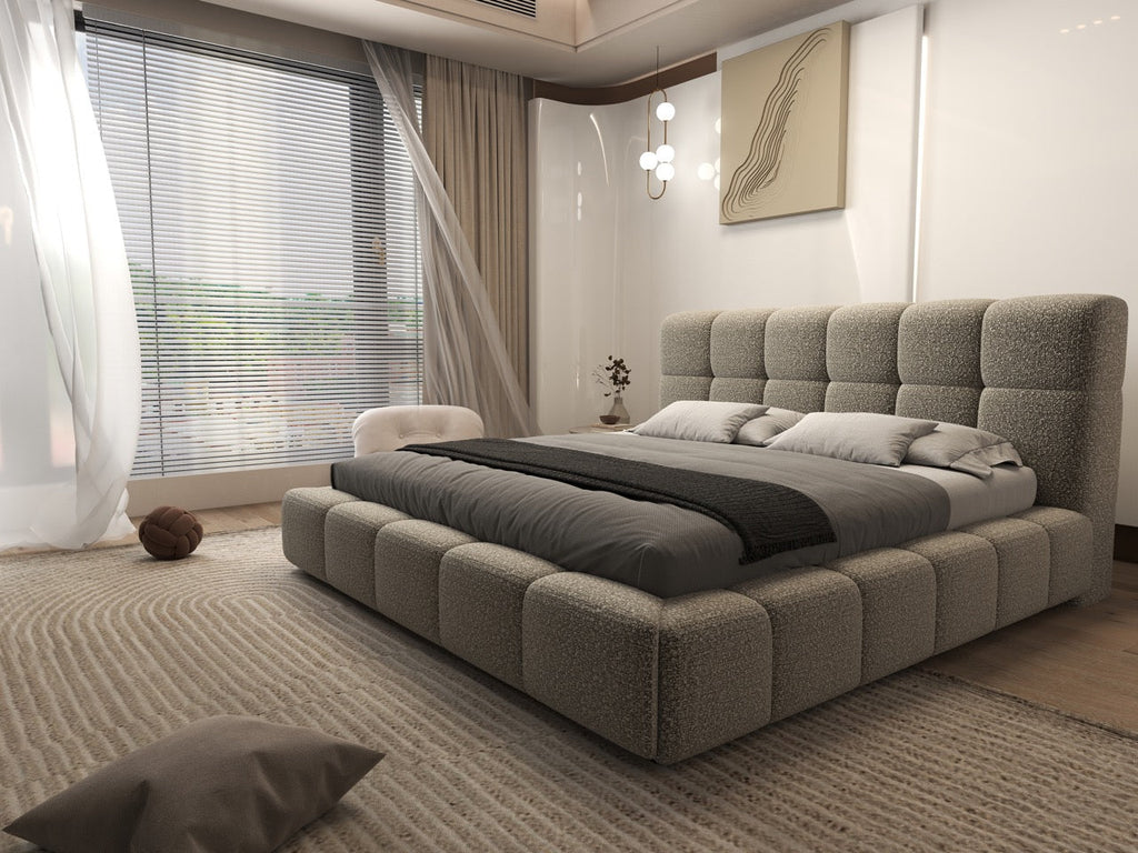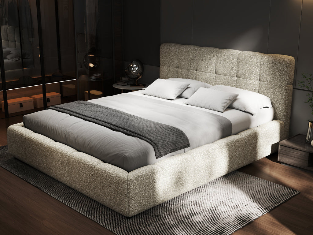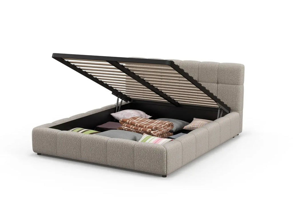 Pat dormitor dumonde, tapitat bej, Lorenzo 160x200 cm, somiera rabatabila inclusa, spatiu depozitare