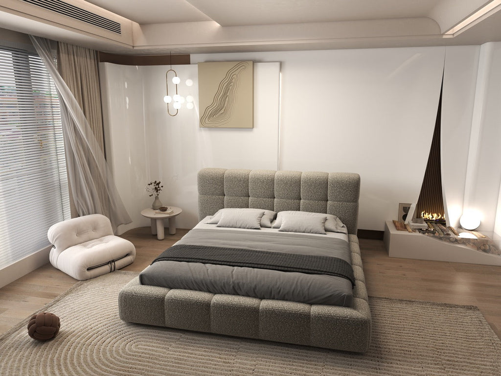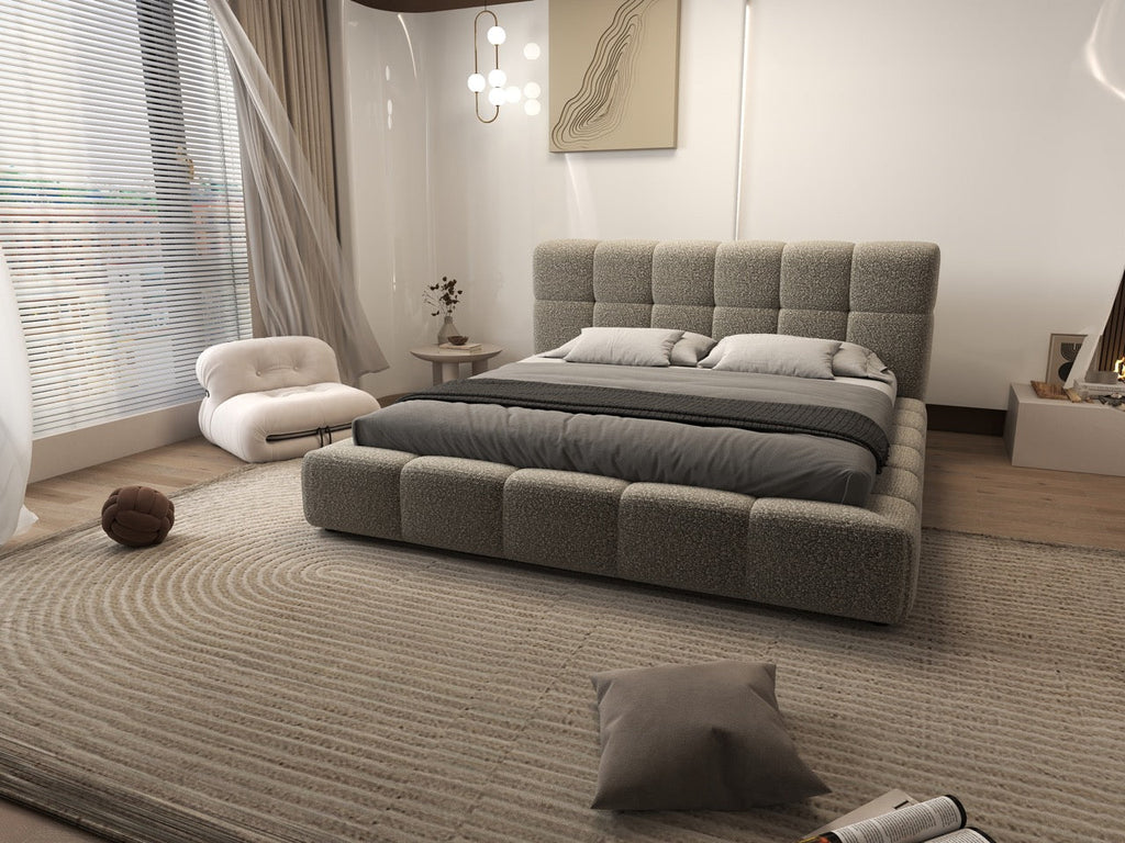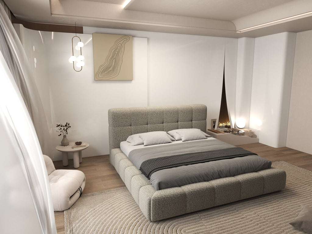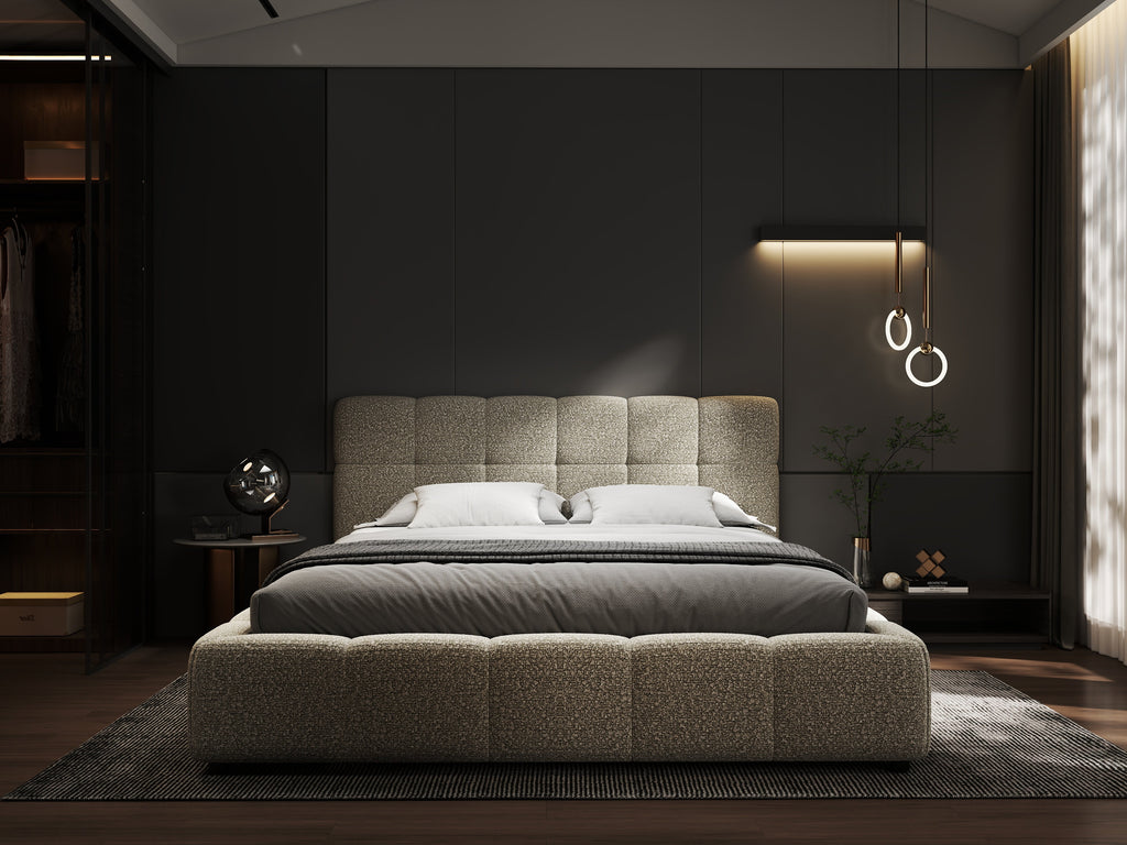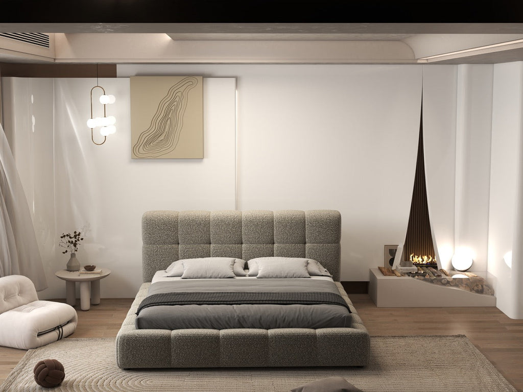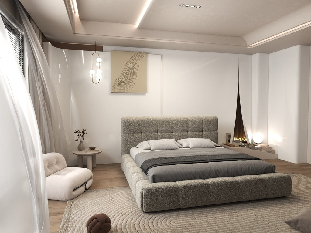 Pat dormitor dumonde, tapitat bej, Lorenzo 160x200 cm, somiera rabatabila inclusa, spatiu depozitare