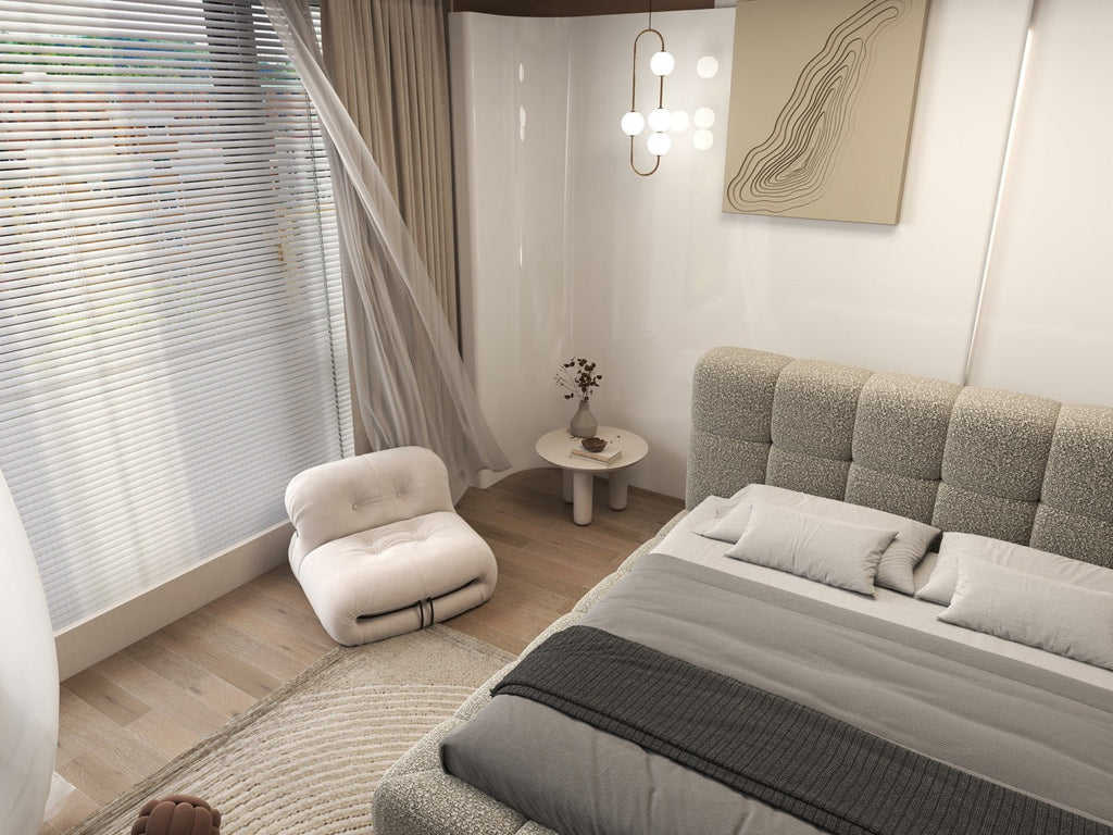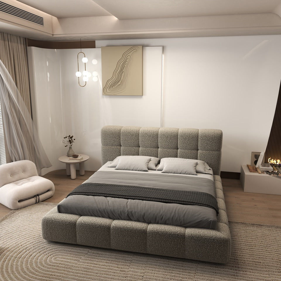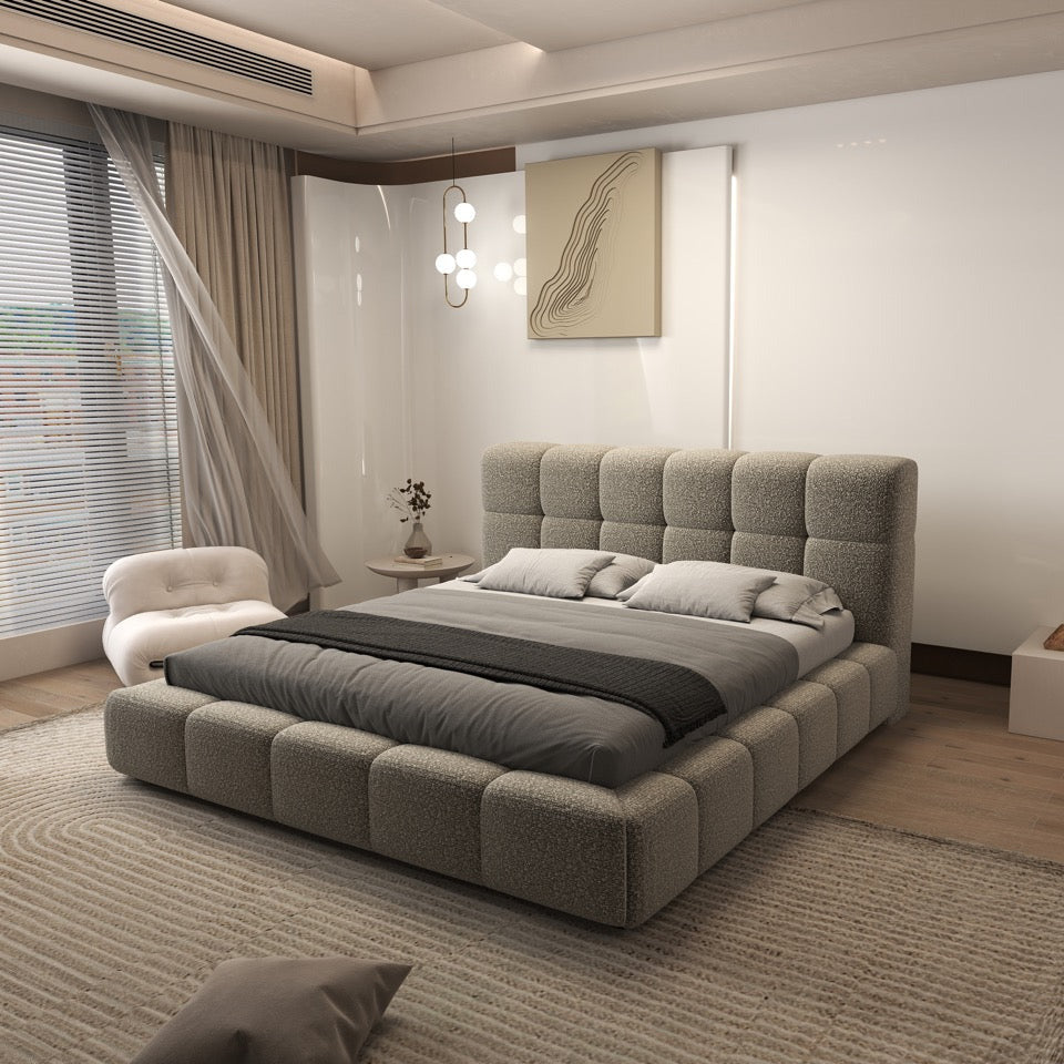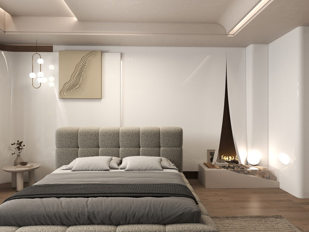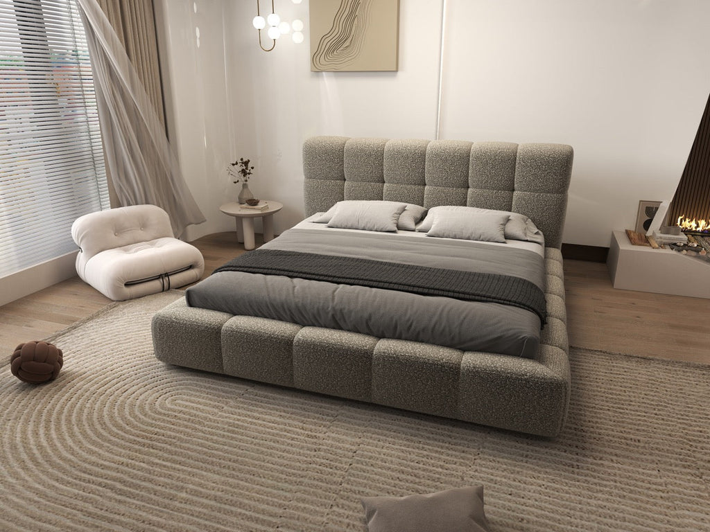 Pat dormitor dumonde, tapitat bej, Lorenzo 160x200 cm, somiera rabatabila inclusa, spatiu depozitare