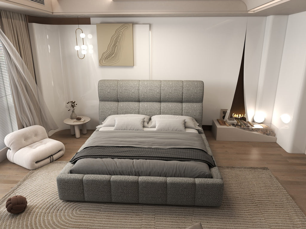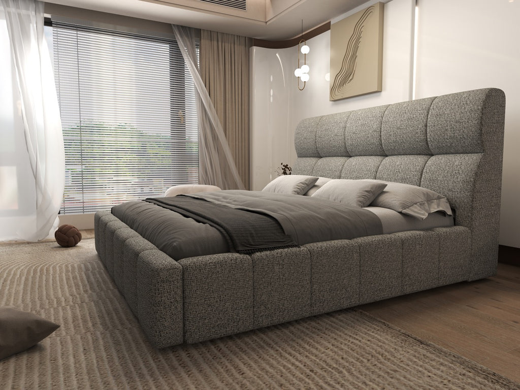 Pat dormitor dumonde, tapitat bej, Prestige 180x200 cm, somiera rabatabila inclusa, spatiu depozitare